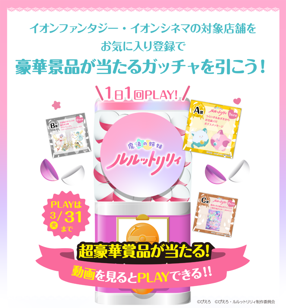 いかがでしたでしょうか。『魔法の姉妹ルルットリリィ』は、映画上映を皮切りにこれからますます広がっていく新たなぴえろ魔法少女シリーズ。新作のわくわく感に加えて、ここでしか狙えない賞品の特別感をまとめて味わえるのが、今回のコラボの魅力です。1日1回限りの特別なガッチャに毎日挑戦して、『魔法の姉妹ルルットリリィ』の世界を楽しんでみてくださいね♪