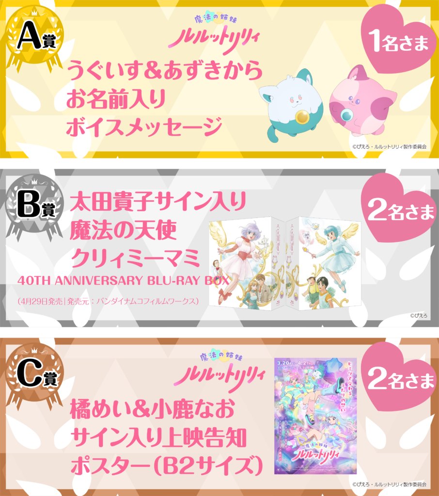 賞品は、『うぐいす&あずきから当選者に向けたボイスメッセージ(1名)』、太田貴子さんサイン入り『魔法の天使クリィミーマミ 40th Anniversary Blu-ray BOX(2名)』、『橘 めいさん&小鹿なおさんサイン入り上映告知ポスター(2名)』など、特別なものばかりです。