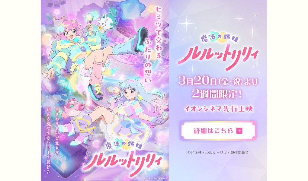 『魔法の姉妹ルルットリリィ』は、4月からのTVアニメ放送に先がけて、3月20日から第1話・第2話の先行上映を実施。さらに同時上映で、『魔法の天使クリィミーマミ』第1話も楽しめます。
