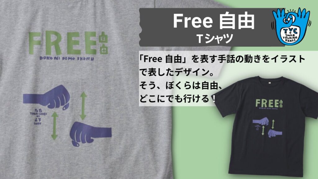 ポップなデザインが、よく見ると手話の動き、というところがポイント!「実はこれって手話なんだ」と会話のきっかけになりそうです。