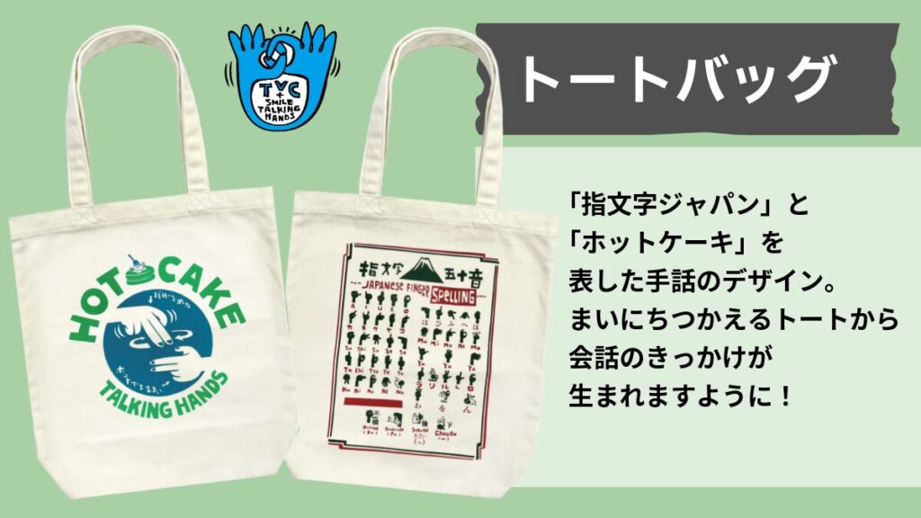 Tシャツにはない「ホットケーキ」を表す手話もとってもかわいいです。まいにち持ち歩くトートバッグなら、会話のきっかけをつくるシーンも増えそう!